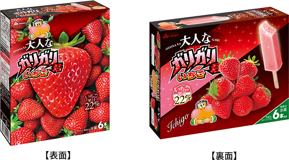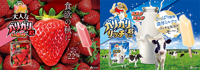 「大人なガリガリ君いちご」は、いちごアイスの中に、ガリガリ食感のジューシーないちごかき氷を入れたアイスキャンディーです。いちご果汁22%使用の本格的ないちごの風味をお楽しみいただけます。 「ガリガリ君リッチミルクミルク」は、ミルクアイスの中に、ガリガリ食感の濃厚なミルクかき氷を入れたアイスキャンディーです。