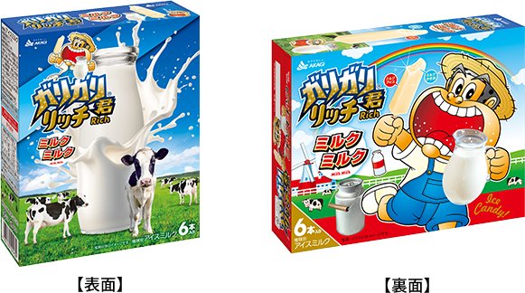 今回は「食欲の秋」をテーマに、パッケージの片面はそれぞれの味を美味しそうに感じ食欲をそそる表現として、「大人なガリガリ君いちご」は真っ赤に実った苺をぎっしり詰め込み、「ガリガリ君リッチミルクミルク」は牧場の風景を背景に瓶からミルクが溢れ出るデザインを採用しました。