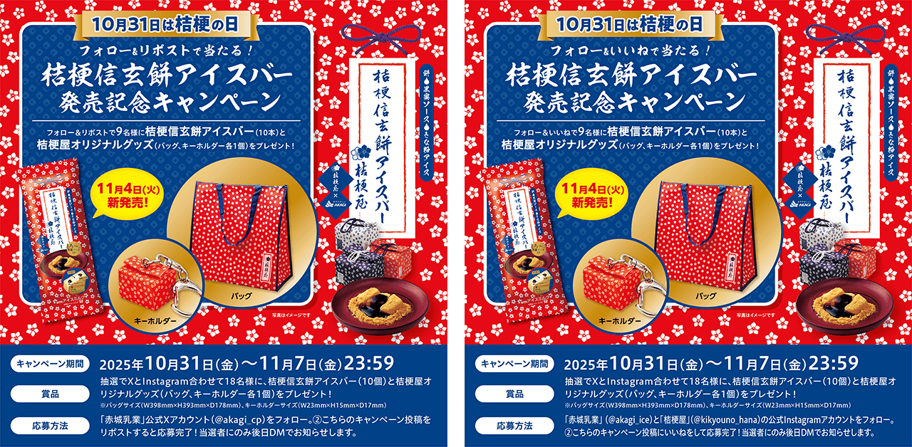 また、桔梗信玄餅ファンの皆さまに喜んでいただける企画として、2025年10月31日(金)「桔梗の日」から11月7日(金)の期間で、「桔梗信玄餅アイスバー」と「桔梗屋オリジナルグッズ2種(バッグ、キーホルダー)」が合計18名様に当たるキャンペーンを赤城乳業公式X、公式Instagramで実施いたします。