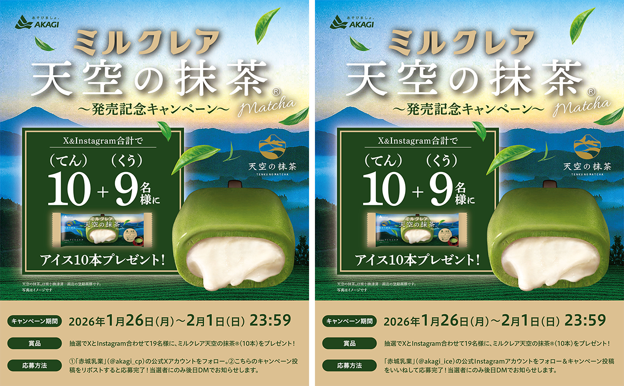 また、皆さまに喜んでいただける企画として、2026年1月26日(月)より「ミルクレア天空の抹茶®」が当たるキャンペーンを赤城乳業の公式X、公式Instagramで開始いたします。