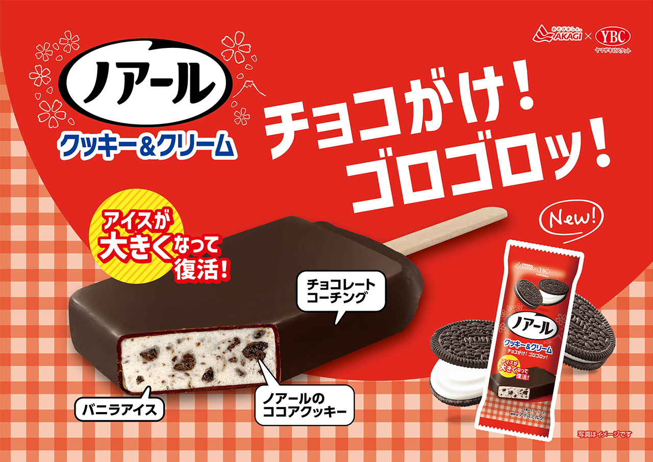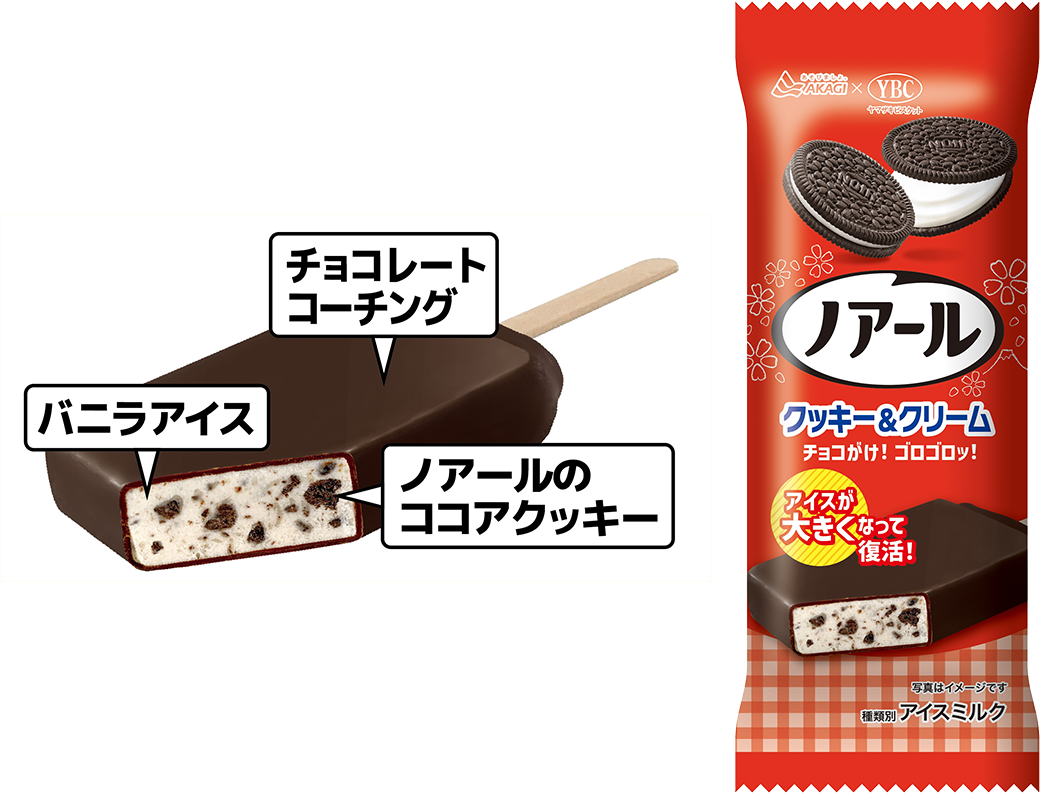 2024年の発売よりご好評をいただき、今回で3度目のコラボとなりました。2025年はコンビニエンスストア限定発売でしたが、今回はより多くの皆さまにお楽しみいただけるよう、販売チャネルを拡大し、再登場します。 この商品は、「ノアール」のココアクッキーを混ぜ込んだバニラアイスをチョコレートコーチングで包み込んだ、満足感のある仕立てです。 今回のリニューアルでは「ノアール」ファンの皆さんにもっと満足していただくために、美味しさはそのままに、アイスが大きくなりました。