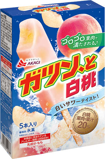 「ガツン、と白桃」は、白桃果肉・果汁20%使用したアイスです。白いサワーに白桃果汁を入れた甘酸っぱいアイスキャンディーに白桃果肉をガツン、と詰め込み、最後まで果肉感を楽しめる、満足感が高い商品に仕上げました。 ぜひ「ガツン、とみかん」と一緒に、ゴロゴロ果肉で満たされる贅沢な果実体験をお楽しみください♪