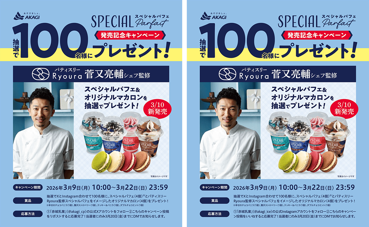 パフェアイス購入者様への調査をきっかけに、スペシャルパフェの商品開発がスタートしました。「パティスリーRyoura」の菅又亮輔シェフが監修し、風味や食感、全体の構成にこだわり尽くしたスペシャルな仕様です。合計100名様に豪華賞品が当たるキャンペーンを赤城乳業の公式SNSで開始いたします。