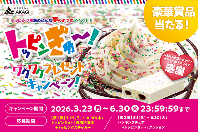 赤城乳業株式会社(本社:埼玉県深谷市、社長:井上創太)は、「トッピンぎゅ~!」を3月24日(火)より全国発売いたします。