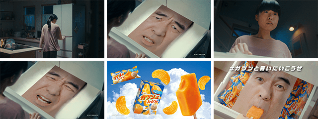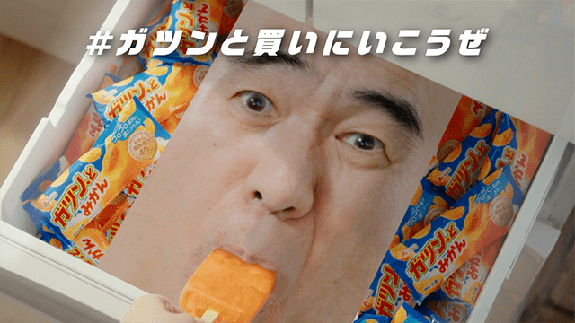 新WEBCMでは、女性がアイスを食べようと冷凍庫を開けると、中から江頭2:50さんが登場します。「ないねぇ。ガツン、とみかんがないねぇ。」と、「ガツン、とみかん」がないことを嘆きます。最後には、買ってきてもらったガツン、とみかんを頬張り、満面の笑みになります。「ガツン、と」を買ったら、ぜひ「#ガツンと買いにいこうぜ」でSNSに投稿してください♪江頭2:50さんが皆さんの投稿を見てくれるかも!? 「ガツン、とみかん」は、みかんアイスキャンディーに、みかん果肉をガツン、と詰め込んだ仕様です。ゴロゴロ果肉で満たされる贅沢な果実体験を、どうぞお楽しみください♪