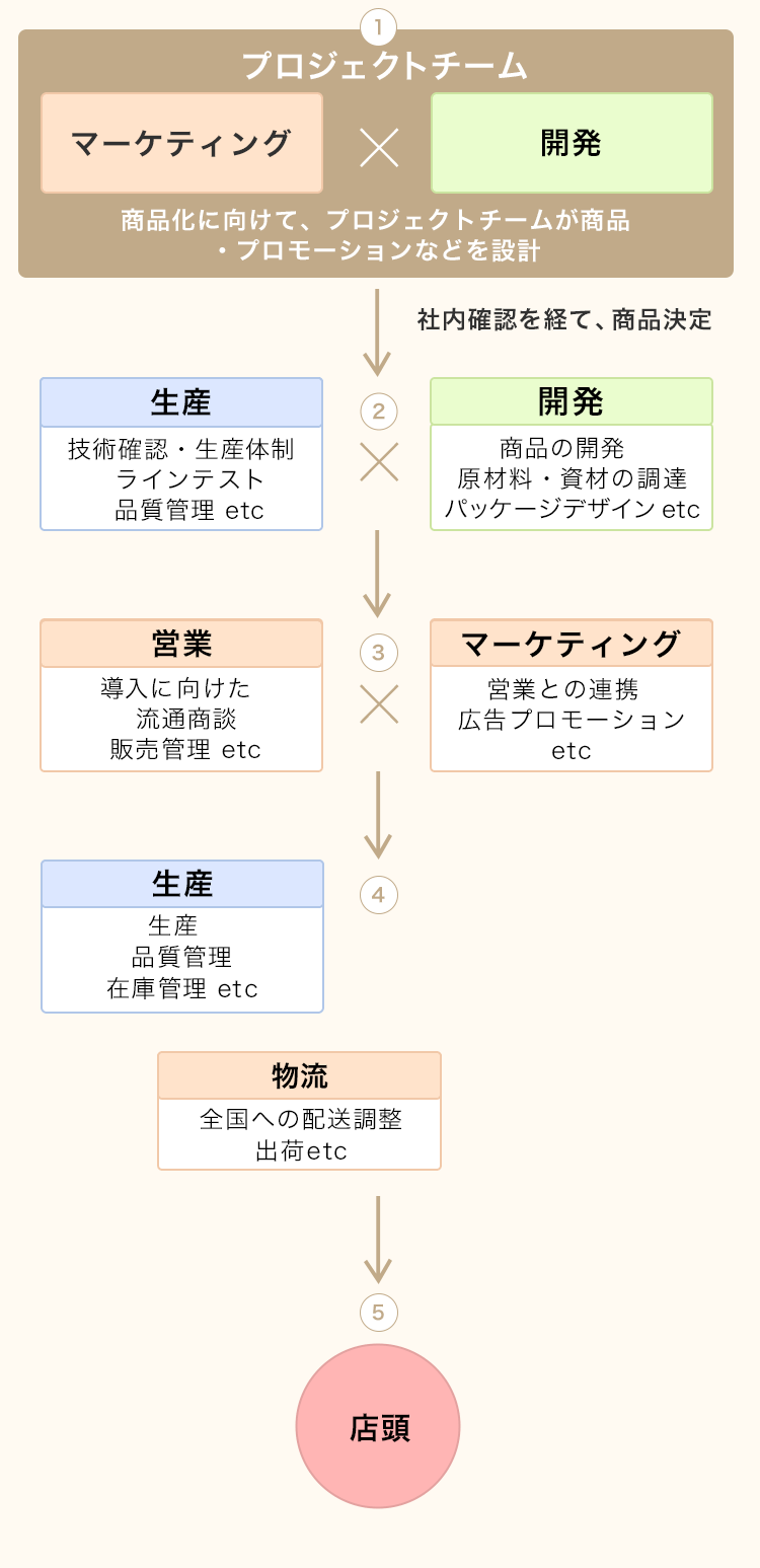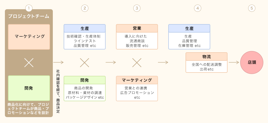 - ④さらにマーケティングが広告プロモーションの準備に取り掛かり、営業と連携しながら小売店様・卸問屋様にも